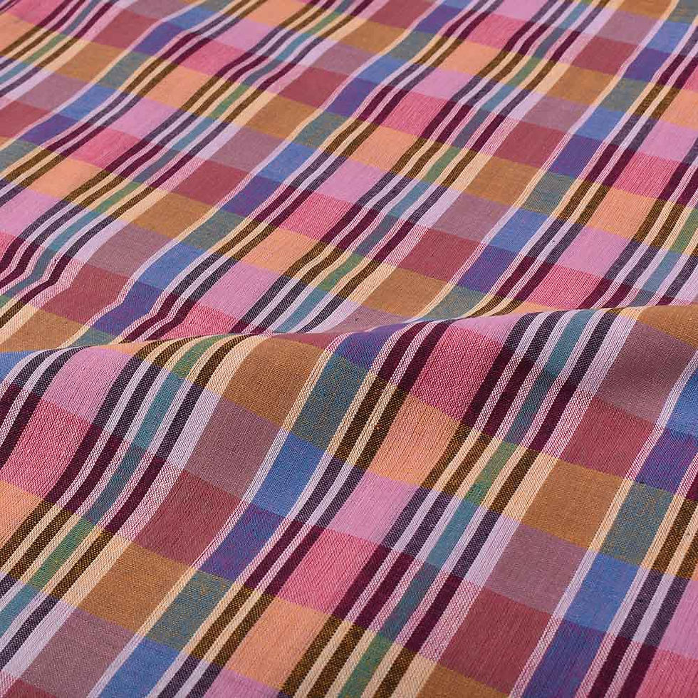 • Woven on the handloom, this cotton fabric features classic checks in a beautiful pairing of a reddish brown and sky blue. Lightweight (65 grams) with a natural drape, it’s perfect for scarves, shirts, blouses or even light home décor accents.